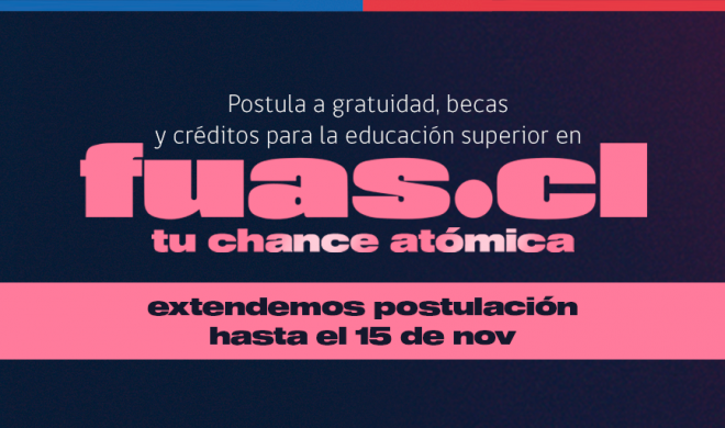 Con el objetivo de que todos los jóvenes que aún no han podido concluir su inscripción tengan tiempo para hacerlo, el Ministerio de Educación extendió el proceso de postulación a la gratuidad, becas y créditos para la Educación Superior 2020 hasta el próximo viernes 15 de noviembre a las 14:00 horas. En este proceso, los estudiantes que quieran ingresar a centros de formación técnica, institutos profesionales o universidades, y aquellos que ya están cursando una carrera y no cuentan con ayudas estudiantiles, podrán completar el Formulario Único de Acreditación Socioeconómica (FUAS) en www.fuas.cl y así estar postulando a todos los beneficios estudiantiles del Estado.