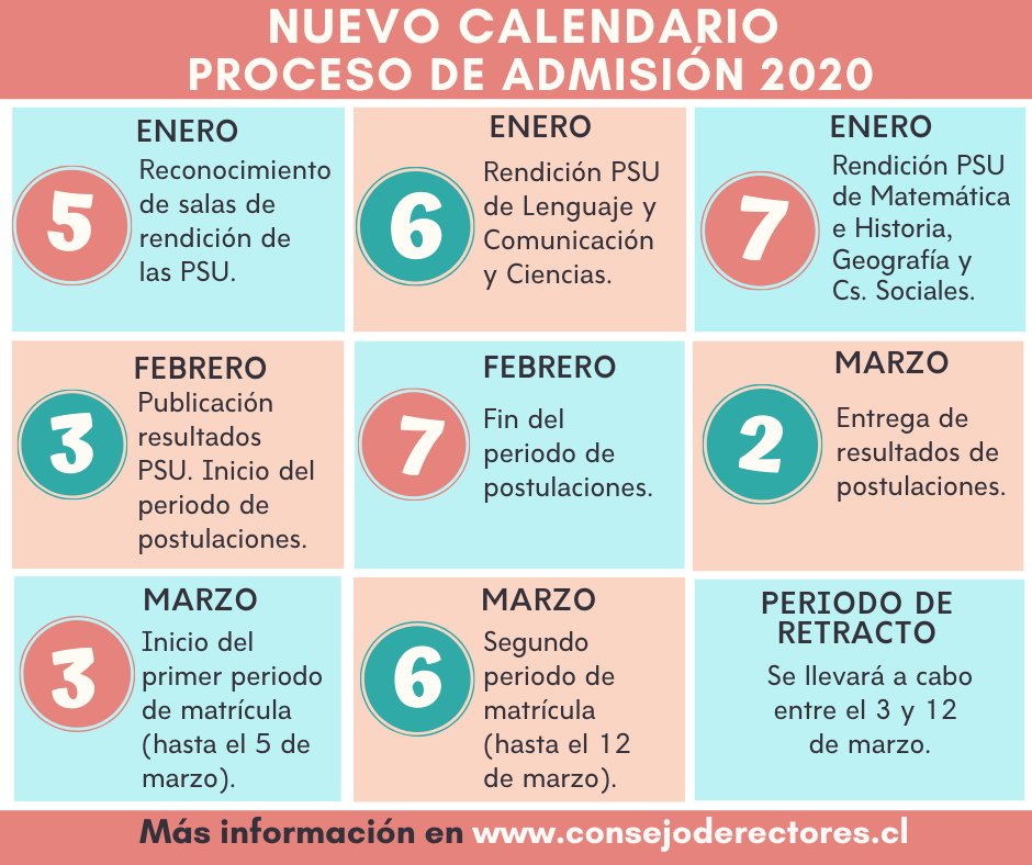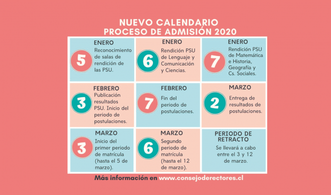 Tras la postergación de las fechas de rendición de las Pruebas de Selección Universitaria al 6 y 7 de enero de 2020, el Consejo de Rectores actualizó el calendario del Proceso de Admisión 2020.