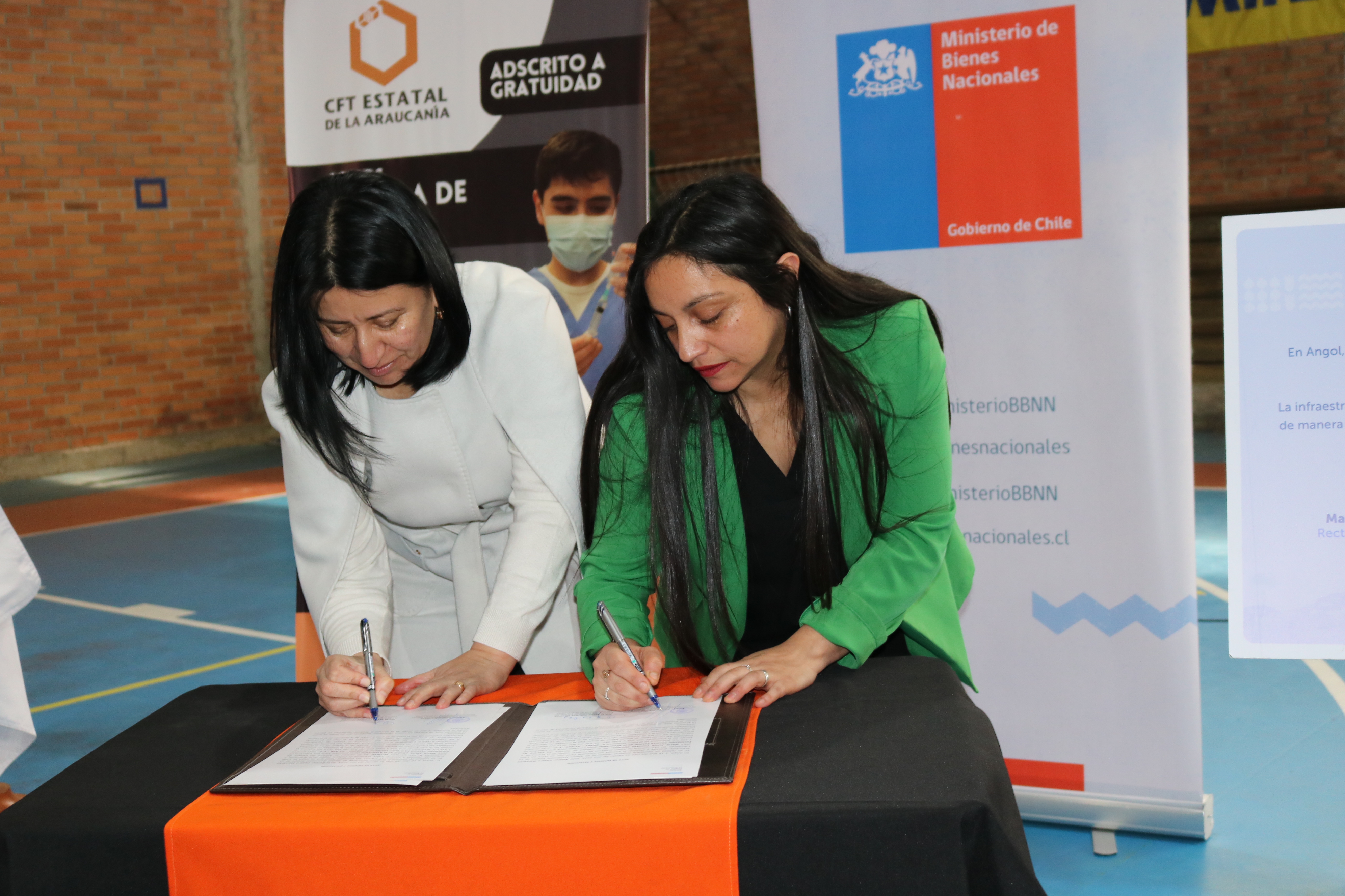 Con la firma de la Seremi Ámbar Castro Martínez y de la rectora María Elena Fuentes Morales, el Ministerio de Bienes Nacionales formalizó este mediodía la entrega en concesión del edificio de calle Caupolicán 425 al Centro de Formación Técnica de la Región de La Araucanía (CFT Estatal).